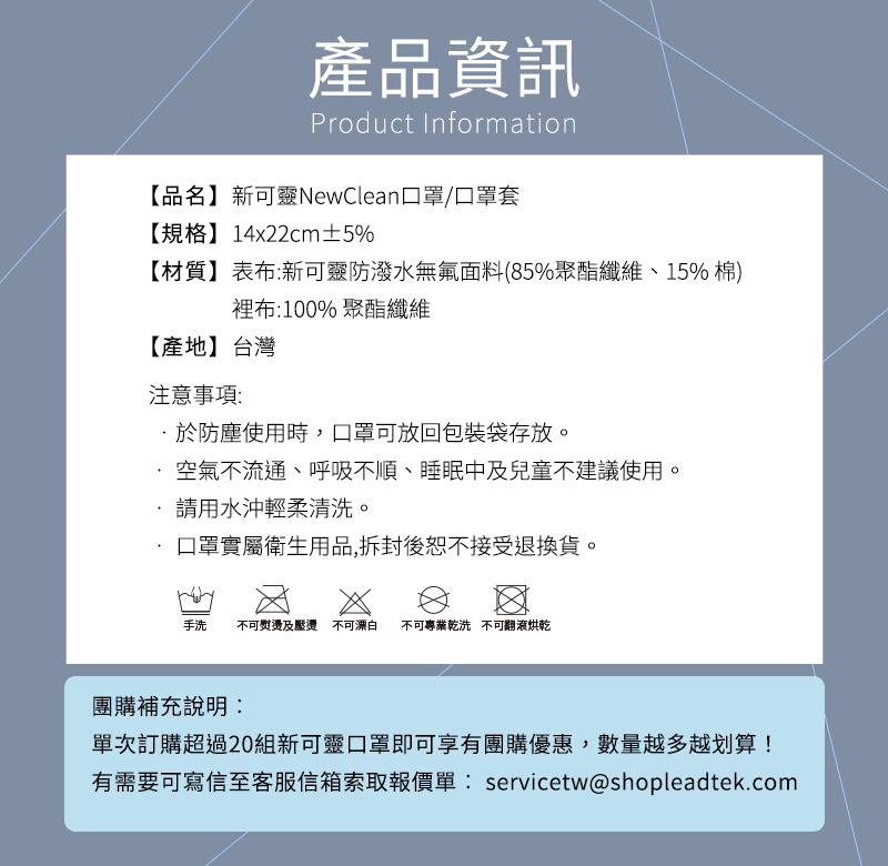 A 經實驗證實,新可靈口罩/口罩套在沖洗50次內,仍然保有100%防潑水能力在沖洗50次以上,建議噴上新可靈奈米長效保潔劑加強防護。