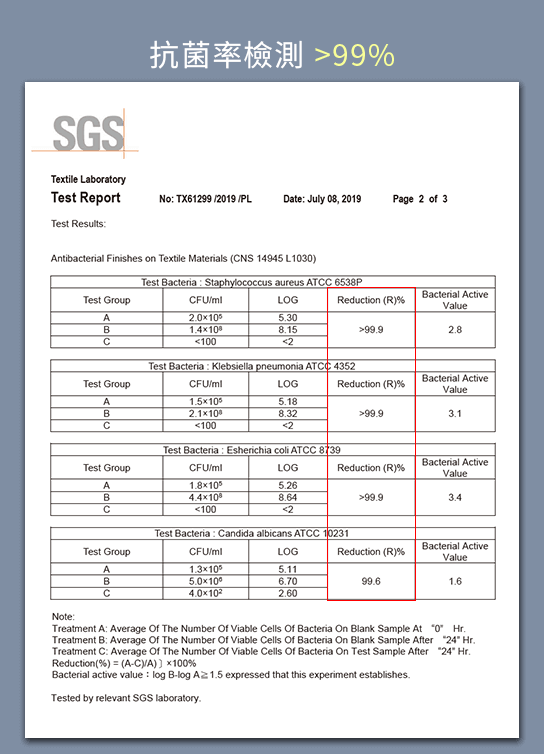 SGS測試抑菌率>99% SGS NO: TX61299 |
