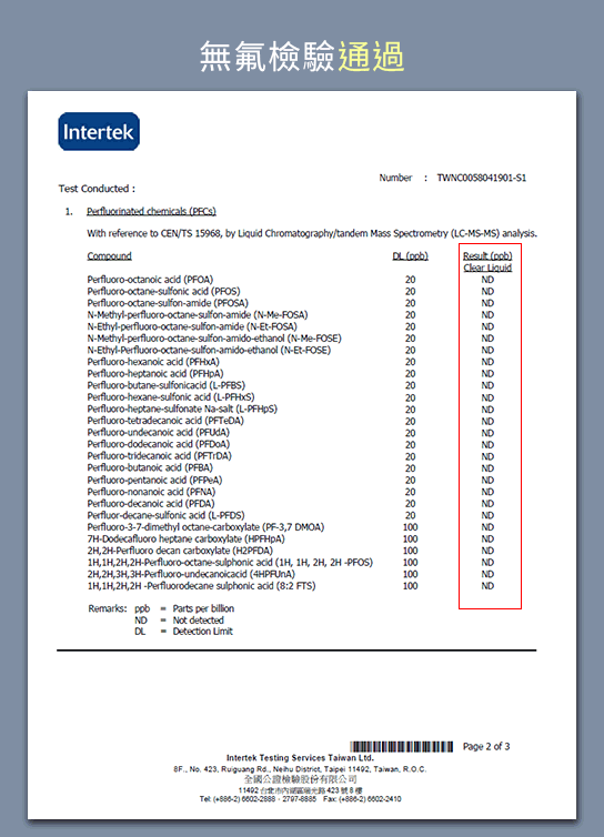 Intertek PFCs檢測 : NO. TWNC0058041901-S1